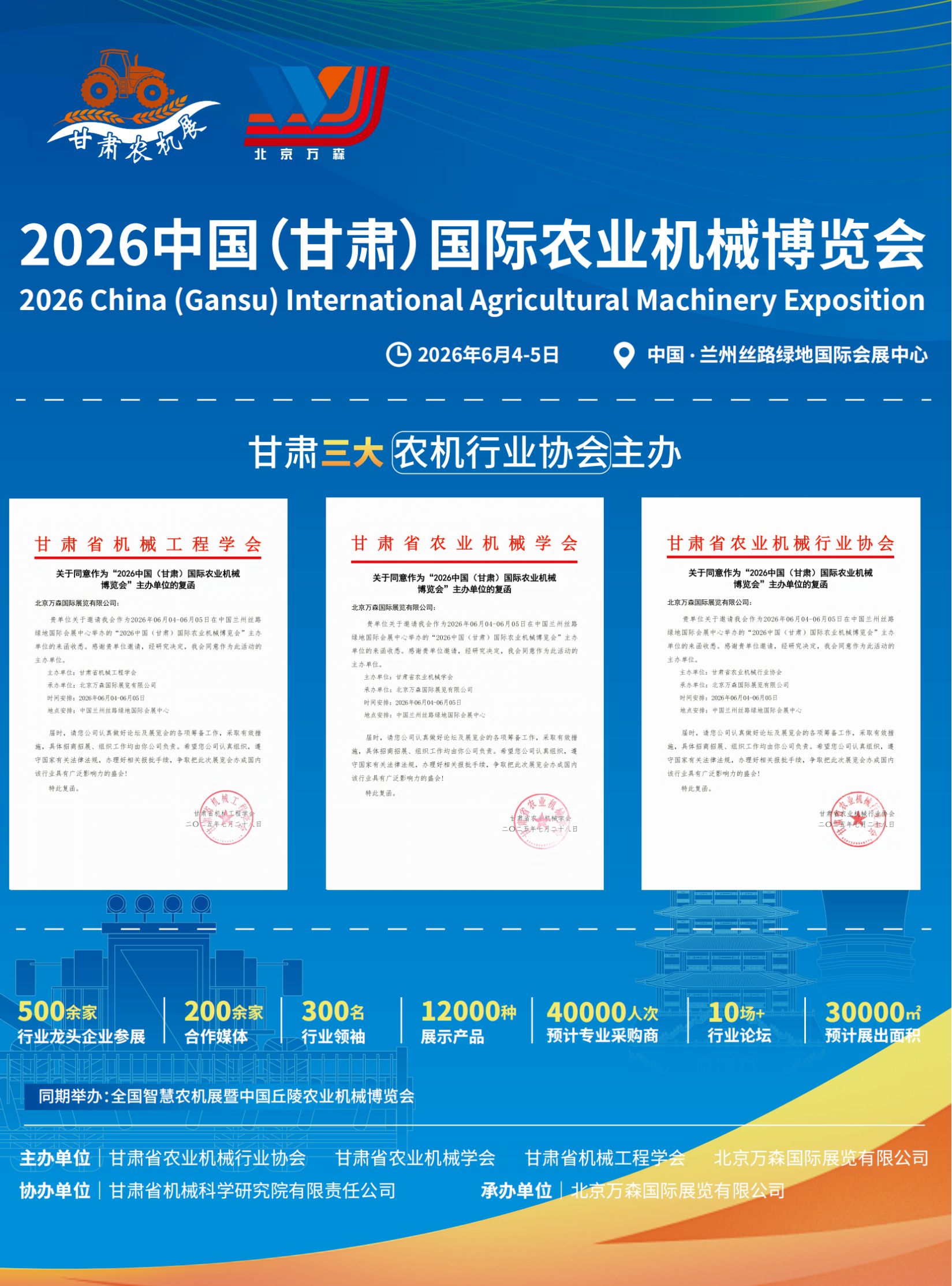 甘肃省,位于中国西北部,地域辽阔,地形地貌复杂,气候多样,干旱高 寒、光照时间长、昼夜温差大、天干地不干,拥有得天独厚的农业资源和发展潜力。丰富的劳动力资源、独特的民族传统工艺以及强有力的政策支持,这些优势为甘肃农业的 发展提供了坚实的基础和广阔的空间。未来,随着农业现代化进程的不断推进和农业产业结构的不断优化升级,甘肃省在农业发展方面展现出显著的优势,这些优势不仅推动了当地农业产业结构的优化升级,也为全省乃至全国的粮食安全和农业可持续发展作出了重要贡献。随着现代农业的快速发展与科技创新的不断推进,农业机械化已成为提升农业生产效率、保障粮食安全、促进农业可持续发展的重要途径。为了进一步加强农机行业交流与合作,展示最新农机科技成果,推动农机装备产业升级,由北京万森国际展览有限公司承办的“2026中国(甘肃)国际农业机械博览会”(以下简称“甘肃农机展”)将于2026年6月4日-5日在甘肃兰州丝路绿地国际会展中心举行。同期举办“全国智慧农业农机展及中国丘陵农机博览会”,大会以“智汇农机,助力乡村振兴——共绘甘肃现代农业新蓝图”为主题,全面展示了各类农机及零部件产品,共计参展企业500余家,参展面积30000平米,展示产品达12000多种,专业观众预计达40000名人次。